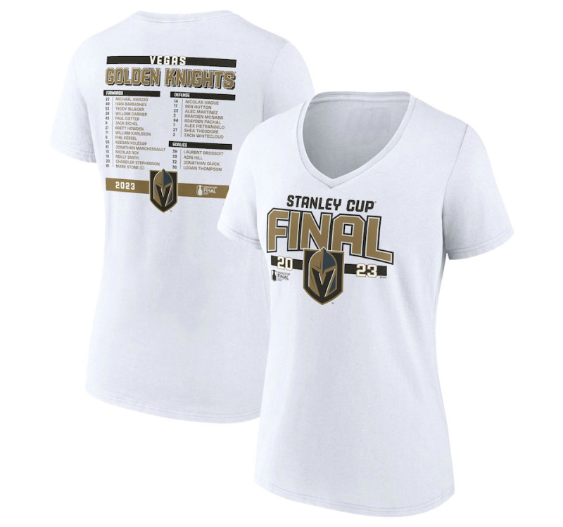 - Product ID: VGK-0000923 Vegas Golden Knights Women's 2023 Stanley Cup Final Plus Size Roster V-Neck White T-Shirt